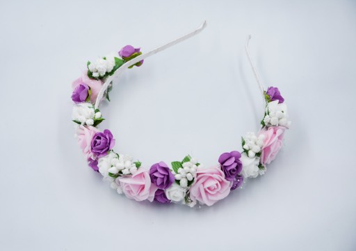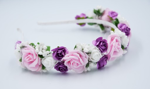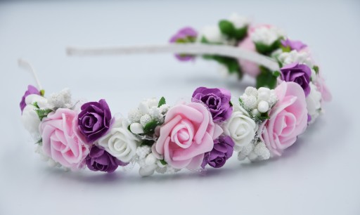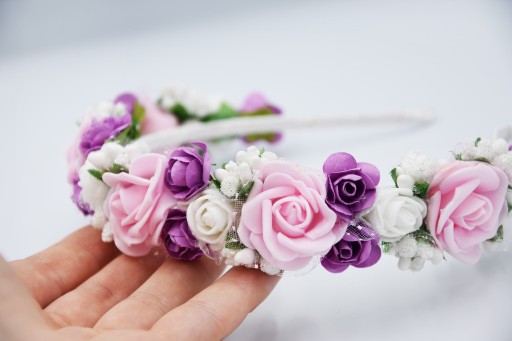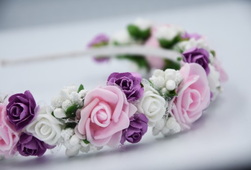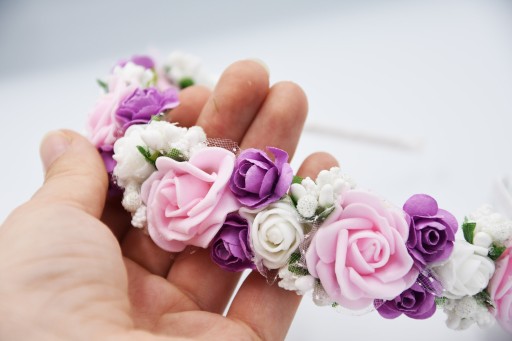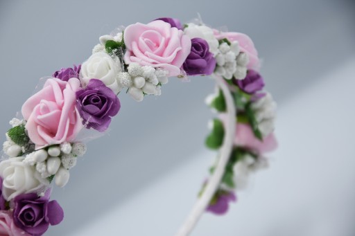 OPASKA różówa wianek komunijny kwiaty fioletowe na głowę na komunije wesele