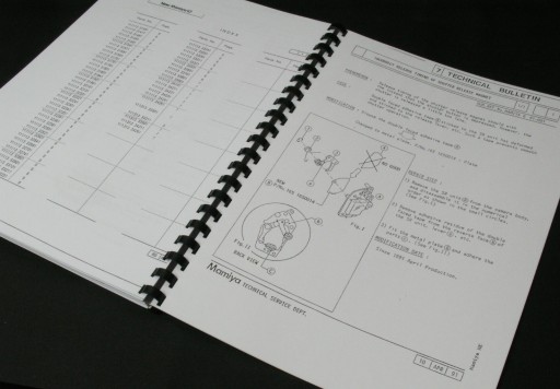 Aż 122 strony! - w tym super dokładne dane korpusu, wszystkich mechanizmów wewnętrznych oraz obiektywów 50 / 75 / 150, a także Mamiya Shutter - czyli migawki; w tym kilkadziesiąt (ponad 60!) szczegółowych rysunków technicznych oraz Parts List czyli listy części z katalogowymi numerami referencyjnymi plus dwustronna wkładka "Wirgin Diagram" - szczegółowy schemat okablowania oraz dodatek "Technical Biulletin": Incorrect Release Timing of Shutter Release Magnet.