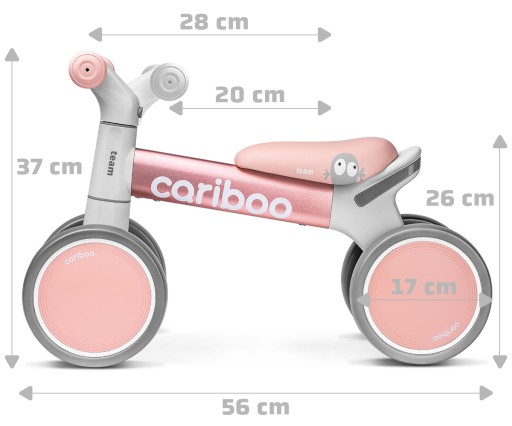 Cariboo Team został wyposażony w cztery, szeroko rozstawione koła, aby zapewnić maluszkowi maksymalną stabilność, a co za tym idzie ułatwić naukę jazdy. Pierwsze kroki na rowerku mogą być sporym wyzwaniem dla malucha. Stabilna, czterokołowa konstrukcja daje dziecku poczucie większego komfortu i bezpieczeństwa, a co za tym idzie większą pewność siebie. Nauka jazdy na rowerku Cariboo Team przebiega dzięki temu w sposób szybki i bezstresowy.