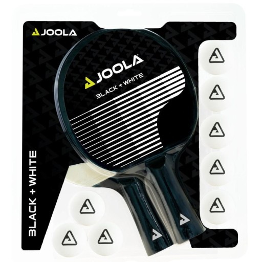 Zestaw do tenisa stołowego JOOLA czarno-biały składa się z 2 wysokiej jakości rakietek JOOLA z gumami w różnych kolorach z przodu i z tyłu oraz 8 piłeczek. Modna rakieta oferuje doskonałe właściwości gry i gwarantuje dobrą zabawę. Piłeczki dopasowują się kolorystycznie do rakiet i poprawiają swoją widoczność podczas rozgrywki.
