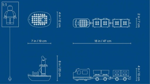 W zestawie znajdziesz lokomotywę do zbudowania z funkcją ręcznego startu, światłami i dźwiękami, a także dwa wagony towarowe z wywrotkami, pięć klocków funkcyjnych w różnych kolorach, port z małym dźwigiem i łódką, duży dźwig, kawiarnię, stację przeładunkową i 24 fragmenty torów, w tym zwrotnice, wzgórza, przejazd kolejowy i kozły oporowe.