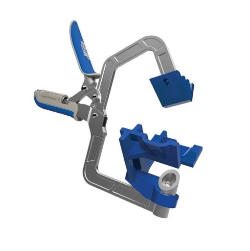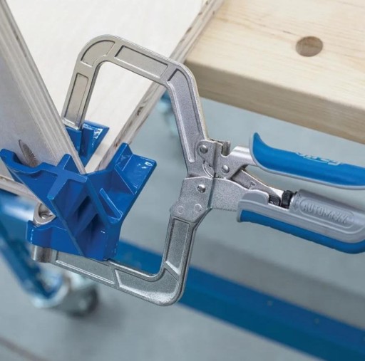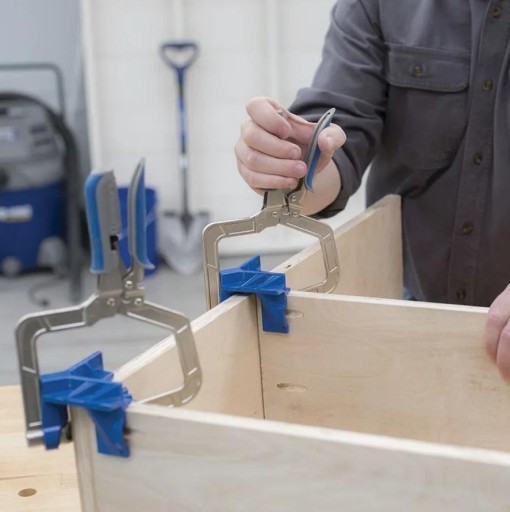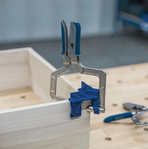 Zacisk narożny Kreg® 90° zapewnia pomocną dłoń, której potrzebujesz, aby bezpiecznie utrzymać narożniki 90° i połączenia "T" podczas montażu pudełek, szuflad, szafek i skrzyń. Dodatkowo, zacisk narożny 90° pozostawia obie ręce wolne, aby można było dodać elementy złączne. Ten poręczny zacisk ułatwia wyrównanie elementów projektu, a technologia Kreg Automaxx® sprawia, że obsługa zacisku jest szybka i niezawodna - zacisk zamyka się automatycznie z ustawioną siłą nacisku, niezależnie od materiału, czy to w przypadku cienkiej sklejki do szuflad, czy materiałów o grubości do 25 mm. Szczęki ścisku w kształcie litery V pewnie trzymają współpracujące elementy, zapewniając precyzyjne ustawienie elementów pod kątem 90° podczas wkręcania wkrętów Kreg lub nawet innego rodzaju łączników, takich jak gwoździe lub wkręty do drewna.