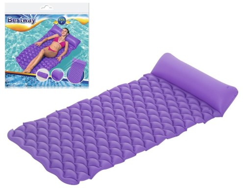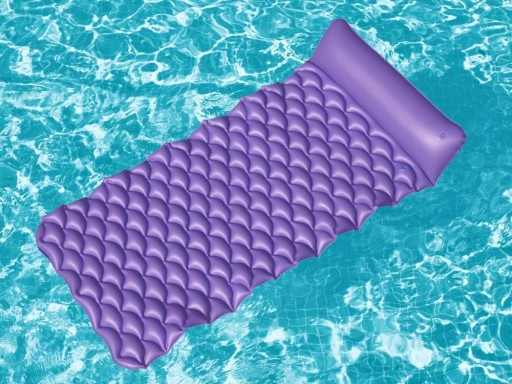 Dmuchany turkusowy materac, który można łatwo zrolować to ciekawa propozycja firmy Bestway na nadchodzący sezon letni. Materac można wykorzystać podczas odpoczynku na wodzie lub jako matę plażową. Ogromną jego zaletą jest możliwość wygodnego zwinięcia go w rolkę, przez co nie zajmuje dużo miejsca podczas transportu i ułatwia każde plażowanie. Dmuchany leżak z zagłówkiem posiada 2 komory powietrzne oraz ciekawą fakturę, duża pikowana powierzchnia świetnie sprawdzi się w upalane dni, zapewniając komfort podczas użytkowania. Materac ma wymiary 213 cm x 86 cm, został wykonany z lekkiego ale wytrzymałego tworzywa PVC, jest w stanie utrzymać osobę o wadze do 90kg.