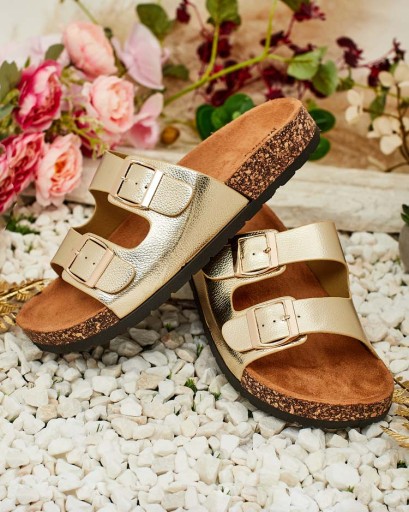 Świetne damskie klapki na płaskiej podeszwie. Wykonane w całości z ekologicznej skóry. Posiadają na cholewce ozdobne klamerki. Podeszwa zdobiona materiałem a'la korek. Idealny wybór na wakacje!