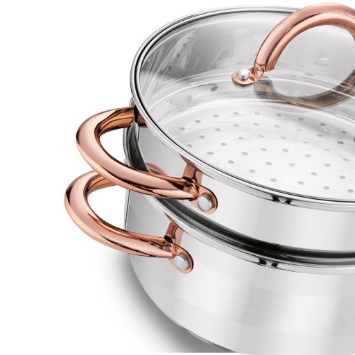 Pozostałe informacje: - garnek oraz wkład do gotowania na parze ze stali nierdzewnej, - uchwyty stalowe w kolorze miedzianym, stylizowane na różowe złoto, nitowane, - pokrywka szklana ze stalowym rantem i odpowietrznikiem, - wysokość garnka: 9,5 cm, - wysokość wkładu: 7 cm, - wysokość garnka z wkładem bez pokrywy: 14 cm, - tylko mycie ręczne