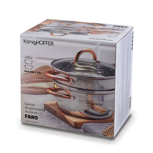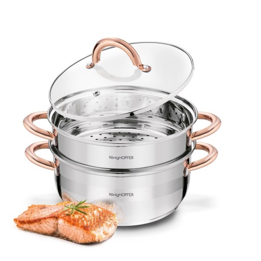 Garnek do gotowania na parze Konighoffer Faro Copper ma pojemność 2,9 l. Produkt wykonano z trwałej stali nierdzewnej i wyposażono w nitowane uchwyty. Składa się on z 3 elementów i jest prosty w pielęgnacji (tylko mycie ręczne). W takim garnku z wyjmowanym sitkiem przygotujesz dla bliskich lekkostrawne i zdrowe posiłki. Użyjesz go do różnych składników, w tym mięs, pyz oraz warzyw. Co więcej, ugotujesz na parze dania bez względu na rodzaj kuchenki. To dlatego, że garnek ma dno przystosowane do użytku na płycie indukcyjnej, ceramicznej, elektrycznej i gazie. Solidne mocowanie rączek da ci bezpieczeństwo podczas przenoszenia oraz pewny chwyt. Jednym słowem zyskasz solidny i energooszczędny garnek do gotowania na parze, który po wyjęciu wkładu z sitkiem może być klasycznym garnkiem do zupy. W komplecie jest przecież dedykowana pokrywka szklana. To dzięki niej jeszcze lepie zatrzymasz w jedzeniu wartościowe mikroelementy, witaminy i zadbasz o soczystość składników.