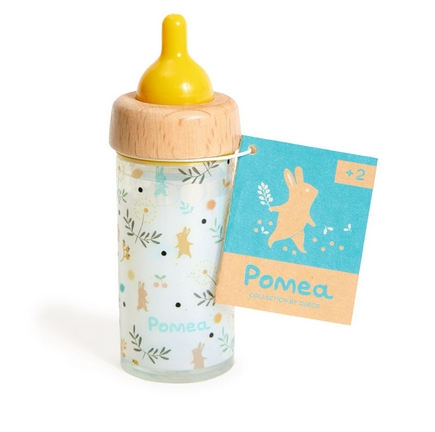 Butelka z mlekiem dla lalek Pomea to niezbędny gadżet do zabawy. Przezroczysta część wykonana jest z odpornego na wstrząsy plastiku PET, a końcówka w kształcie smoczka z drewna posiadającego certyfikat FSC®. Butelka ozdobiona jest delikatnym wzorem w króliczki.