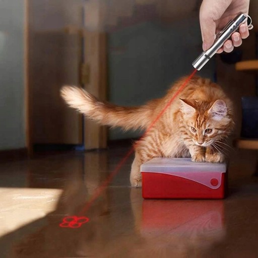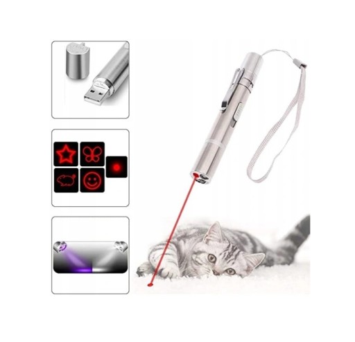 3 tryby i 5 wymiennych zabawek dla kotów: 3 tryby (czerwone światło ultrafiolet białe światło) 5 trybów czerwonego światła (kropka motyl uśmiechnięta twarz gwiazda mysz)