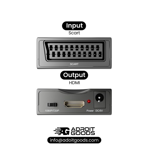 Uwaga: Patrzysz teraz na adapter AdroitGoods SCART do HDMI, wyposażony w wejście SCART i wyjście HDMI. Jeśli potrzebujesz odwrotnego połączenia, AdroitGoods oferuje również adapter HDMI na SCART, który konwertuje wejście HDMI na wyjście SCART.