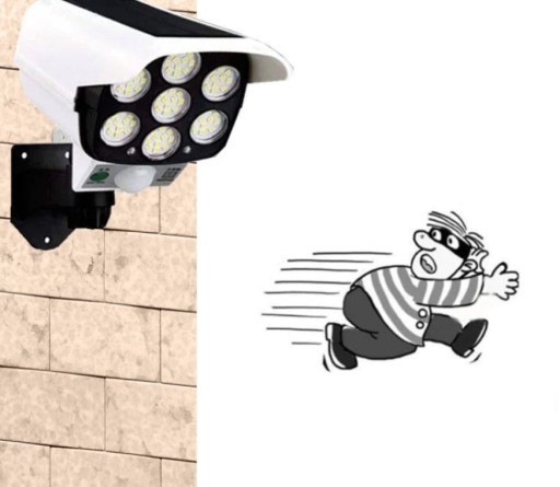 Lampa pod diodami led posiada wbudowaną atrapę kamery , atrapa kamepry natomiast posiada wbudowaną migającą diodę led imitującą pracę kamery, jest to doskonały straszak na nieproszonych gości.