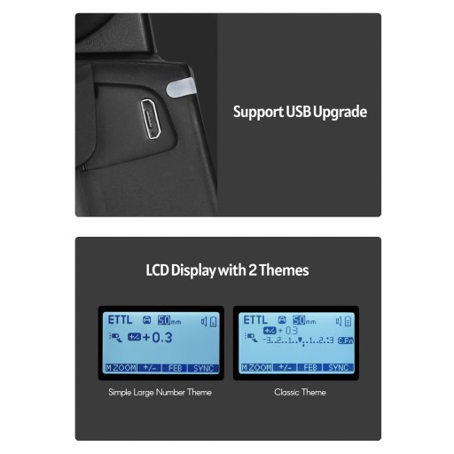 - Duży wyświetlacz LCD: Wygodne jest wyświetlanie lub ustawianie różnych funkcji lampy błyskowej wyraźnie i intuicyjnie. 2 motywy wyświetlacza można dowolnie zmieniać.