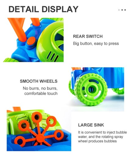 Bańki puszczane są automatycznie. Mały wiatraczek znajdujący się w górnej części obudowy silnika kosiarki, wytwarza strumień powietrza, który kierowany jest na 8 kręcących się pierścieni. Zanurzają się one w pojemniku na płyn do wytwarzania baniek i po kolei podsuwają pod małą dyszę. W ten sposób bańki puszczane są nieustannie. Dzięki 8 pierścieniom, zabawka wytwarza równocześnie dużą liczbę baniek. Dodatkową zaletą kosiarki są wydawane przez nią dźwięki. Dźwięki jakie możemy usłyszeć to dźwięk baniek mydlanych oraz melodia z bajki. Przy tylnych kółkach umieszczone zostały plastikowe zakładki, które podczas jazdy terkoczą imitując tym samym odgłos wydawany przez prawdziwe urządzenie. Bajecznie kolorowa kosiarka to propozycja niekończącej się zabawy, pobudzającej kreatywność i rozwijającej zdolności manualne. Możesz mieć pewność, że maluch nie będzie miał czasu na nudę.