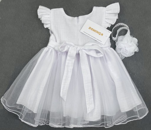 Sukieneczka do chrztu z białego muślinu i tiulu. Góra prosta, przy ramiączkach doszyte skrzydełka a w pasie duży, tiulowy kwiat. Góra sukieneczki posiada podszewkę z bawełny. Dół pokryty dwiema warstwami tiulu, co nadaje jej lekkości i objętości. W komplecie opaska na głowę z pasującym kwiatem.