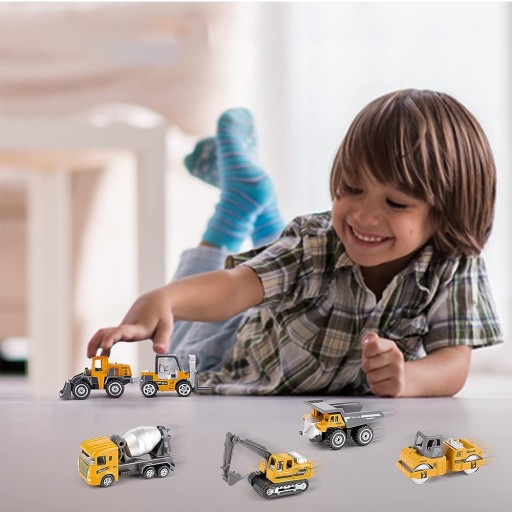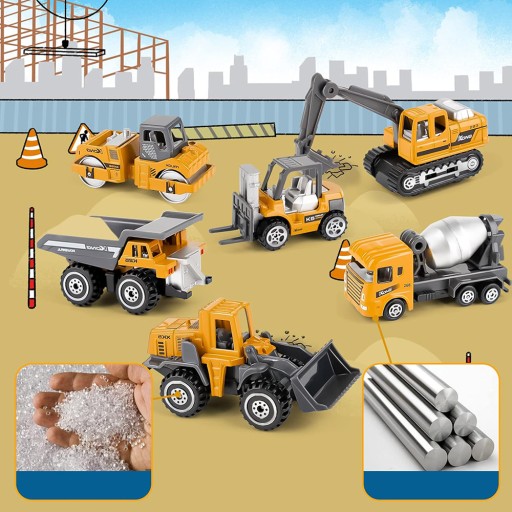 🛻-Zestaw samochodzików składa się z koparki, walca drogowego, wywrotki, betoniarki, spychacza i wózka widłowego do zabawy i zabawy.