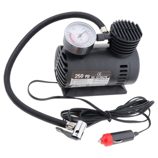 Ten typ przenośnej sprężarki można podłączyć do instalacji samochodowej 12 V w celu naprawy lub napompowania.