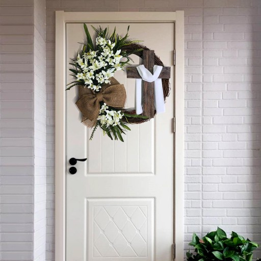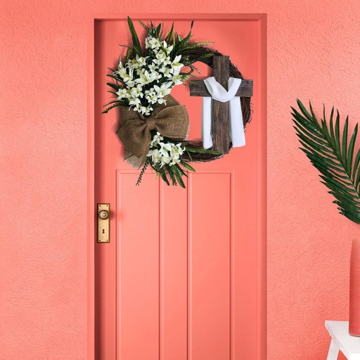 Wiszący wieniec: wieniec wielkanocny z krzyżem, pierścienie rattanowe dekoracja wieniec na drzwi frontowe, piękny kształt i realistyczny