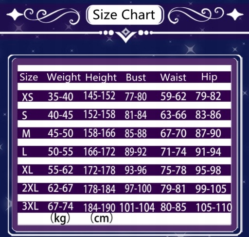 Cechy:Wykwintne krawiectwo, szycie z wielu materiałów. Wykwintne krawiectwo stroju podkreśla sylwetkę. Wyraźne drukowane wzory, bez blaknięcia i barwienia. Ten kostium cosplay można prać tylko ręcznie.
