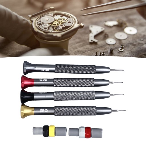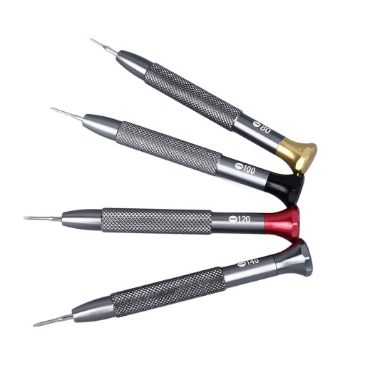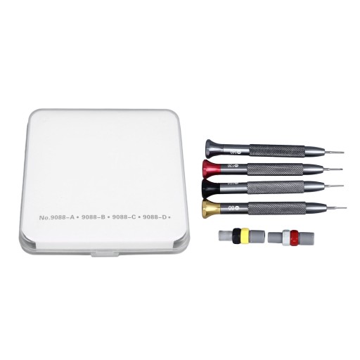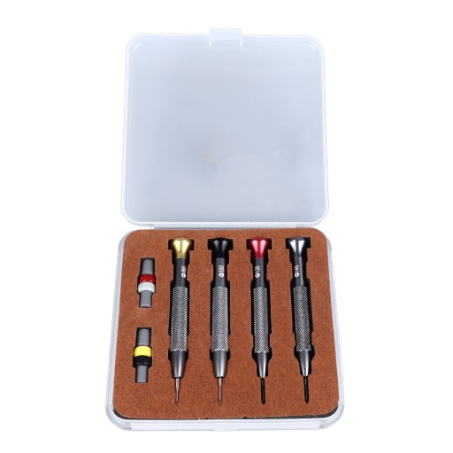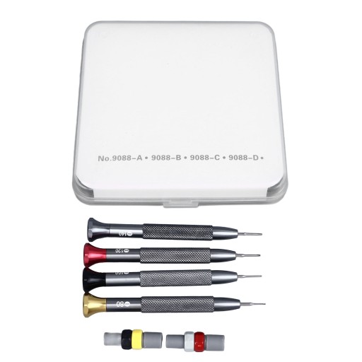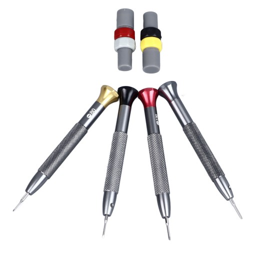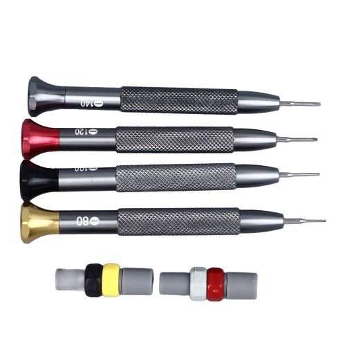 5. Kompleksowy zestaw: zawiera 4 wkrętaki o różnych rozmiarach łbów (0,8 mm, 1,0 mm, 1,2 mm, 1,4 mm) i jest wyposażony w 4 dodatkowe wymienne głowice. Każdy śrubokręt i głowica są oznaczone kolorami w celu łatwej identyfikacji podczas napraw.
