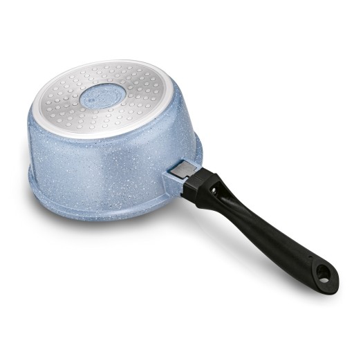 Pozostałe informacje: - garnki odlewane, wykonane z aluminium z powłoką non stick stylizowaną na marmur, - rączka w rondlu przykręcana z tworzywa sztucznego typu soft touch w kolorze czarnym z otworem do zawieszenia, - pokrywki szklane ze stalowym rantem i odpowietrznikiem, - uchwyty pokryw stalowe, przykręcane, - nakładki na uchwyty materiałowe, - podstawki pod garnek bakelitowe, - garnki bez pokryw i rondla mozna używać w piekarniku, maksymalna temperatura użytkowania: 220 st., -działanie garnków na kuchence indukcyjnej jest uzależnione od dopasowania wielkości dna indukcyjnego z polem grzewczym kuchenki (garnek z małą średnicą dna stosować na małym polu grzewczym kuchenki)