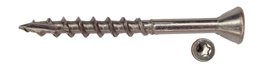 Specjalne wkręty do montażu podłóg drewnianych tarasowych. Wyprofilowany szpic wkręta umożliwia wkręcanie bez wcześniejszego nawiercania, dokładne osadzenie i zmniejsza ryzyko rozwarstwienia się drewna. Kształt gwintu dociąga deskę do legaru i zmniejsza skrzypienie konstrukcji. Nierdzewność klasy A4 zapewnia wysoką ochronę przed korozją.