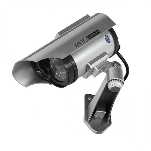 Urządzenie o realistycznym wyglądzie kamery monitorującej z migającą diodą LED, zasilaną panelem solarnym. Urządzenie daje wrażenie ciągłego monitoringu. Atrapa przeznaczona do montażu wewnętrznego i zewnętrznego.