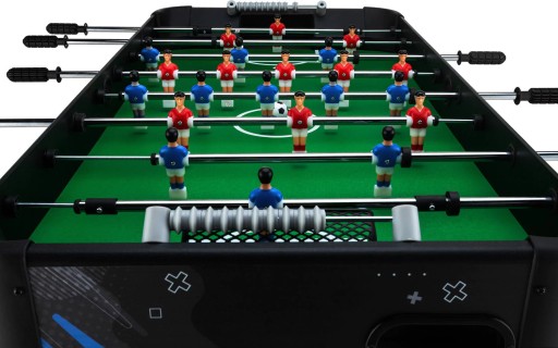 Kolejny atut to teleskopowe prowadnice, które zapewniają bezpieczeństwo podczas gry, eliminując ryzyko naciągnięć czy uderzeń. Prowadnice te oferują płynną i precyzyjną kontrolę nad graczami, co zdecydowanie podnosi komfort i jakość rozgrywki. Nie można pominąć możliwości poziomowania stołu. Dzięki temu, niezależnie od nierówności podłogi, zawsze jesteś w stanie ustawić stół idealnie poziomo. Sprawiedliwa i równa gra gwarantowana jest dla wszystkich uczestników.