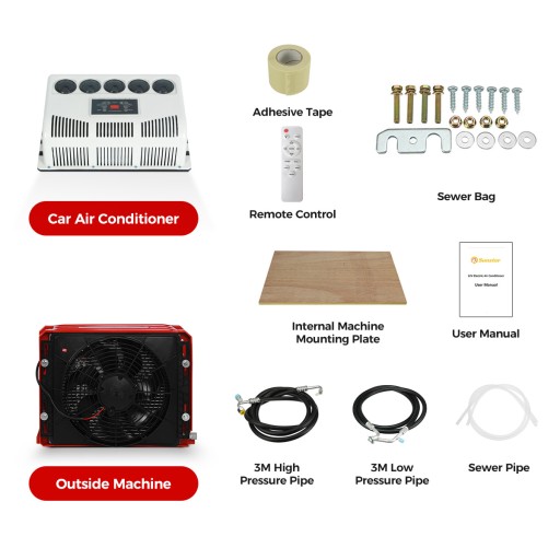 1x12 V klimatyzator samochodowy/1x maszyna wewnętrzna/1x rura kanalizacyjna/1x 3 M rura wysokociśnieniowa/1x 3 M rura niskociśnieniowa/1x wewnętrzna płyta montażowa maszyny/1x śruba worek/1x taśma klejąca/1x wewnętrzne i zewnętrzne linie sygnałowe/1x 3 M linia akumulatora /1x instrukcja obsługi/1x pilot zdalnego sterowania