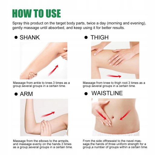 Po przebudzeniu rano spryskaj produkt (3-5ml) na brzuch na pusty żołądek, masuj zgodnie z ruchem wskazówek zegara, aż się wchłonie, zjedz śniadanie 40 minut później, I wykonaj to samo użycie i dawkowanie w nocy przed pójściem spać