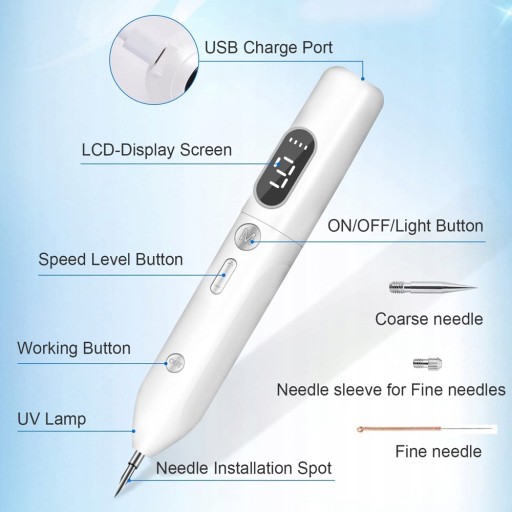 Ten środek do usuwania znaczników skóry ma 9 regulowanych mocy. Użytkownicy mogą wybrać poziom zgodnie z tolerancją skóry. Na ekranie LCD wyświetlany jest stan pracy, stan baterii, stan reflektorów i siła.
