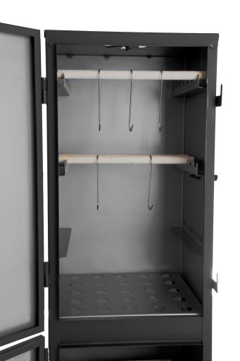 W zestawie termometr, 5 haków wędzarniczych, 3 drążki bukowe, deflektor oraz popielnik.