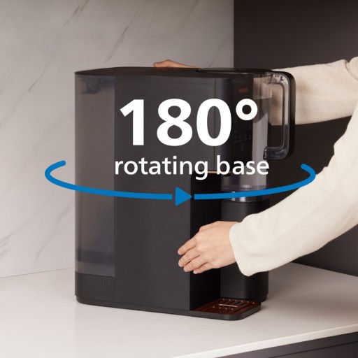 Dzięki możliwości obrotu o 180 stopni, podstawa dystrybutora Philips umożliwia łatwe pobieranie i uzupełnianie wody pod różnymi kątami, zapewniając wygodę użytkowania.