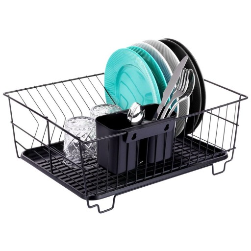 Elegancka suszarka do naczyń w kolorze czarnym. Posiada miejsce na talerze, szklanki oraz ociekacz sztućce. Wyposażona w wyjmowaną tacę ociekową
