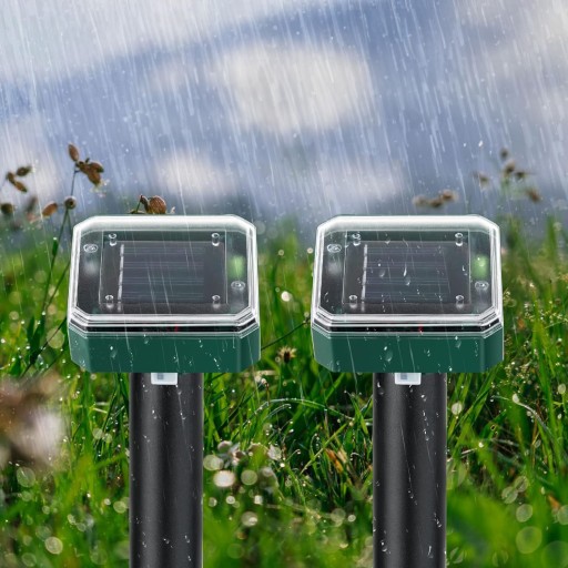 Urządzenie jest bezobsługowe, bezprzewodowe, odporne na zmienne warunki pogodowe i wodę. Odstraszacz działa bez potrzeby stosowania dodatkowych baterii, panel słoneczny ładuje akumulatory.