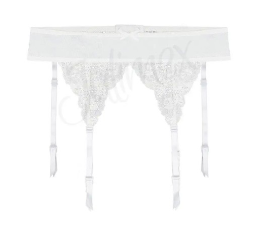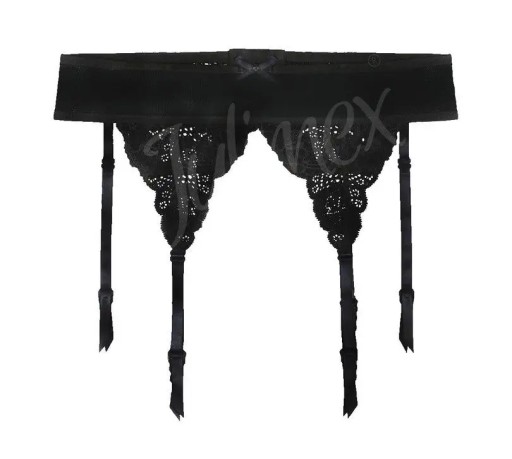 Wąski pas do pończoch uszyty z gładkiej siateczki, na który naszyte są koronkowe trójkąty połączone u góry kokardką.