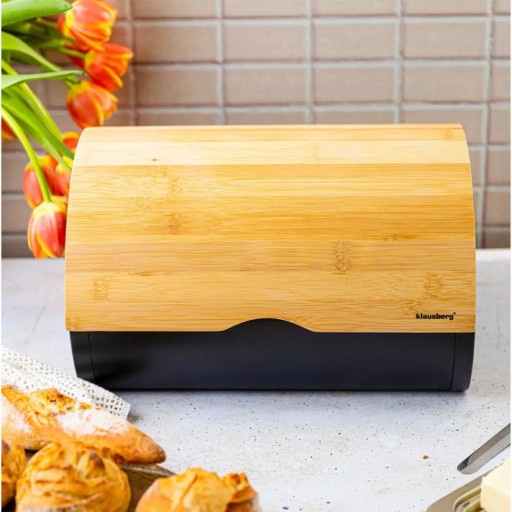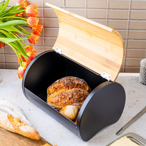 Nowoczesna forma chlebaka, jego efektowny kształt oraz połączenie metalu w czarnym kolorze z bambusem świetnie prezentują się na blacie. Metalowy korpus został pomalowany proszkowo gwarantując większą trwałość i odporność na korozję.