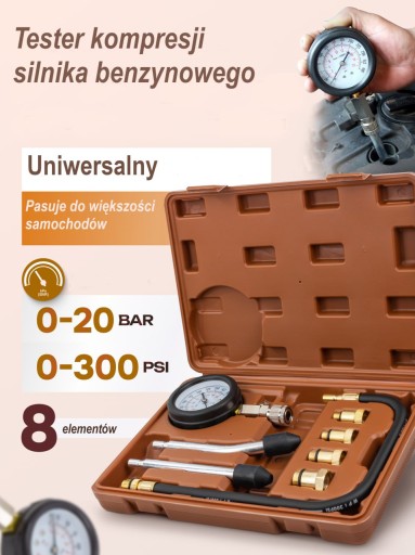 Tester do kontroli ciśnienia sprężania w cylindrach silników benzynowych .Zestaw służy do kontroli ciśnienia sprężania w cylindrach silników benzynowych.