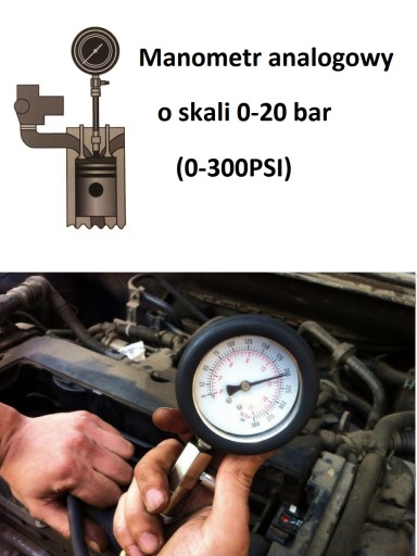 Konstrukcja urządzenie pomiarowe, manometr analogowy o skali 0 - 20 Bar , umieszczony w korpusie adaptera. Manometr wyposażony w 2 rodzaje końcówek: stożkową, gumową , która uszczelnia gniazdo świecy zapłonowej oraz końcówkę wkręcaną w gniazdo świecy ( M10x1.0, M12x1.25, M14x1.25, M18x1.5).