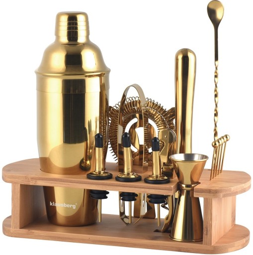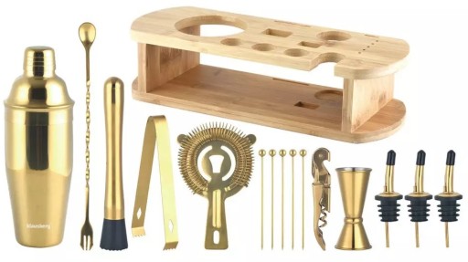 dwustronna miarka 20/40 ml - "jigger" - 1 szt.nalewak do likieru - 3 szt.szpilki koktajlowe - 5 szt. szczypce do lodu - 1 szt.łyżka długa łyżeczka barmańska z widelcem - 1 szt.shaker do koktajli 720 ml - 1 szt.tłuczek barmański typu "muddler" - 1 szt.sitko do lodu - 1 szt.otwieracz do wina - 1 szt.stojak bambusowy - 1szt.
