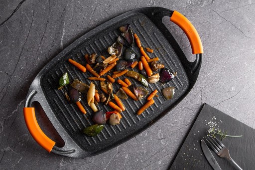 Na płycie grillowej możemy przygotować mięso, warzywa, ryby praktycznie bez tłuszczu. Płytę można ustawić na kuchence (na 2 palnikach lub polach grzejnych) lub wstawić do piekarnika.