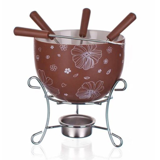 6częśćiowy zestaw Fondue CHOCO BLOSSOMS, zestaw zawiera: 1 x miska ceramiczna średnica 11,5 cm, wysokość 7,5 cm, 1 x stojak z uchwytem do świeczki - wysokość 8 cm, 4 x widelec - długość 15 cm,