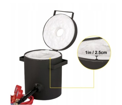 Ten zestaw do topienia metalu zawiera piec propanowy, palnik, 10 kg tygiel, grafitową matrycę blokową, regulowany regulator propanu (0-350 psi), szczypce do tygla, cegiełki ogniotrwałe, rękawice ochronne, tchawicę o długości 2,5 m i taśmę teflonową.