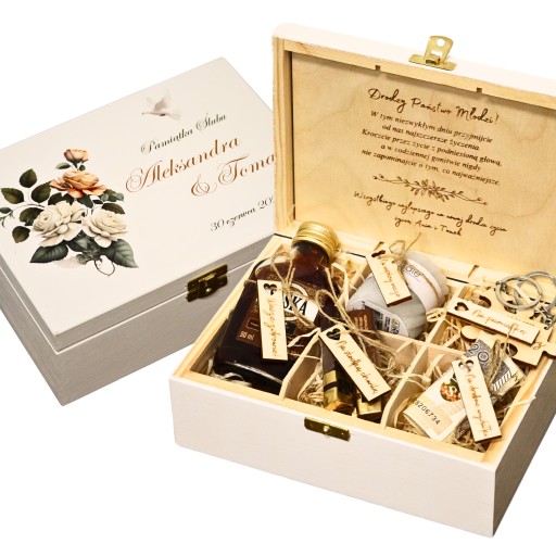 Personalizowane pudełko prezentowe z przegródkami będzie stanowić wyjątkową i oryginalną pamiątkę ślubną na lata!