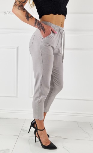 Eleganckie klasyczne spodnie cygaretki 7/8, posiadają wysoki stan. Świetne połączeniu ze szpilkami, dzięki swojej uniwersalności, pasują niemal do każdej stylizacji. Elastyczny materiał podkreśla kobiecą sylwetkę. Podkreśl swoje kobiece kształty! Spraw, by Twój codzienny Look był niepowtarzalny.