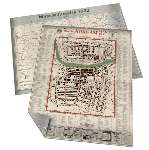 - Duże, rozkładane mapy Arkham i okolicznych terenów.