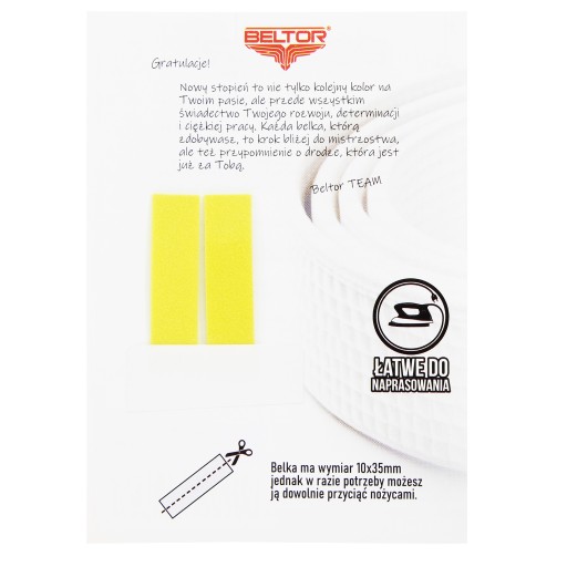 Belki na Obi Beltor to gotowe rozwiązanie na szybkie zamocowanie belki na pasie do kimono! Opakowanie zawiera 2 belki, do naprasowania z przodu i tyłu pasa lub obok siebie. Materiał belki jest bardzo przyjemny w dotyku i przypomina zamsz. Po naprasowaniu jest lekko wypukła i ma piękny żywy kolor. Po aplikacji belka jest trwale związana z materiałem. Można prać w pralce - w temperaturze poniżej 60'C.
