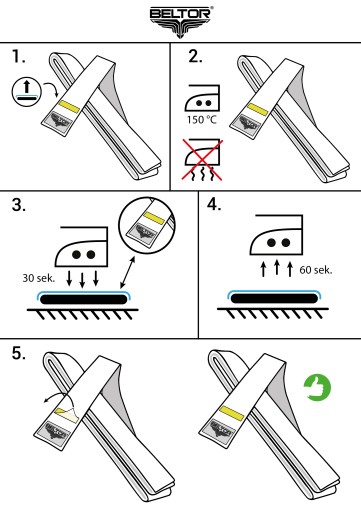4. Po upływie czasu usuń żelazko i pozwól naszywce ostygnąć zanim zdejmiesz folię ochronną (~60 sek.) Ostudzenie zapewnia, że klej odpowiednio zwiąże belkę z tkaniną.