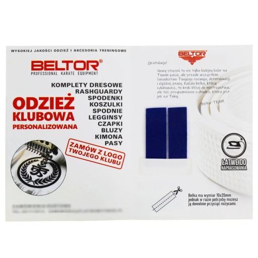 Belki na Obi Beltor to gotowe rozwiązanie na szybkie zamocowanie belki na pasie do kimono! Opakowanie zawiera 2 belki, do naprasowania z przodu i tyłu pasa lub obok siebie. Materiał belki jest bardzo przyjemny w dotyku i przypomina zamsz. Po naprasowaniu jest lekko wypukła i ma piękny żywy kolor. Po aplikacji belka jest trwale związana z materiałem. Można prać w pralce - w temperaturze poniżej 60'C.