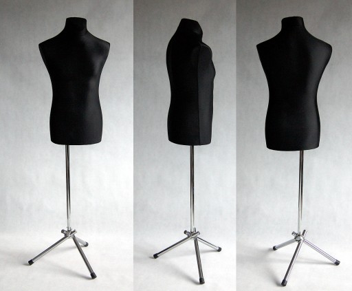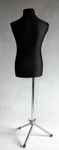 Manekin wykonany z utwardzonego styropianu i ubrany w koszulkę z elastycznej dzianiny w kolorze czarnym.