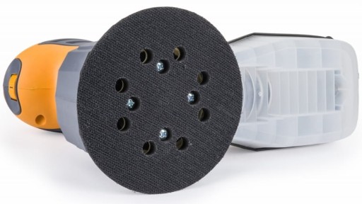 Urządzenie współpracuje z materiałem ściernym o średnicy 125mm z mocowaniem na rzep oraz ośmioma otworami odpylającymi.