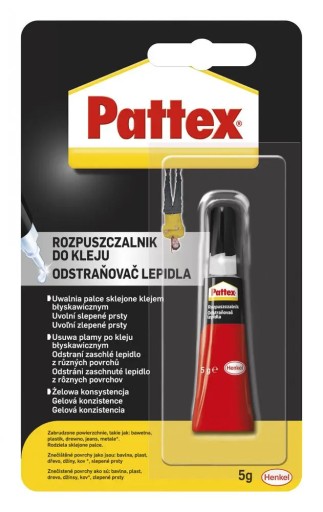 Pattex S.O.S. Rozpuszczalnik do kleju jest jednoskładnikowym rozpuszczalnikiem do usuwania zabrudzeń po klejach błyskawicznych (cyjanoakrylowych). Produkt służy również do usuwania lepkich naklejek, plam z tuszu, zabrudzeń po markerze, jak również uwalniania przypadkowo sklejonych palców. Konsystencja żelowa rozpuszczalnika sprawia, że rozpuszczalnik nie kapie, nie rozlewa się i jest łatwy w aplikacji.
